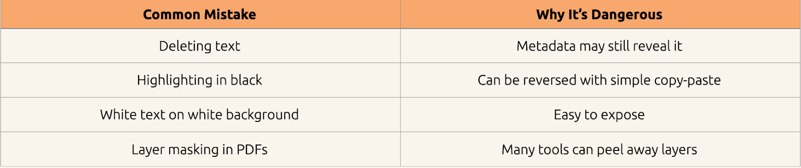 Beware of these shortcuts that might make data appear hidden, but do not actually redact the data (the information is findable).